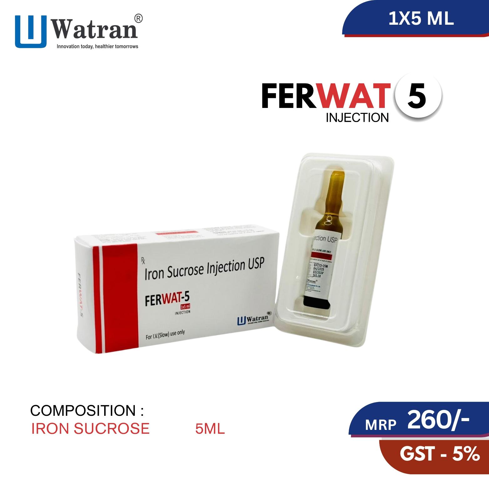 - Iron Sucrose 5 ml injection will be administered by a healthcare professional; do not self-administer. Your doctor will decide the dosage of the Ferwat-5 ml injection based on your medical condition.